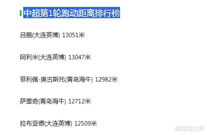 中超首轮跑动距离出炉,吕鹏、阿利米霸榜前二!在这份中超首轮跑动距离排行榜前五名中,三人都来自大连英博,另外两名来自青岛海牛。吕鹏以13051米的跑动距离排名第一,阿利米13047米居次,菲利佩-奥古斯托12982米排第三,萨里奇12712米排名第四,拉布亚德12509米排第五。